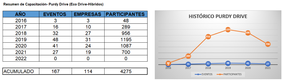 Con el pasar del tiempo, fuimos midiendo el impacto positivo que este programa generaba en los clientes y lo convertimos en algo más integral llamado Purdy Drive. Esto significa que no solamente es manejo eficiente, si no que ve más allá, así como, capacitación del uso de cada producto (vehículo), tipo de producto, seguridad vial, huella de carbono o impacto ambiental, también un tema de ahorro de dinero y por supuesto, un tema de movilidad responsable.